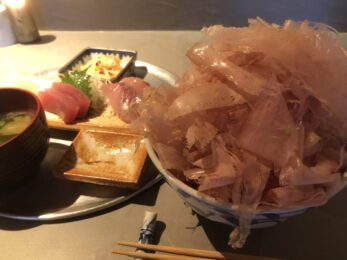 【写真】鰹節御飯とお刺身のセットで1,500円(税込)です。鰹節一杯で口の中に張り付きます・・・。