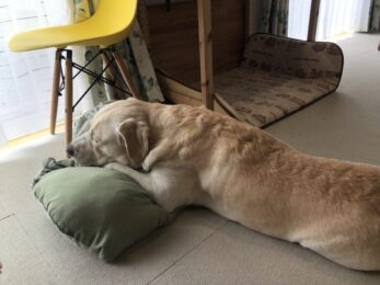 【1月】お正月のころの写真かな?自分でやったのかな?クッションを半分に折って枕にしています♪